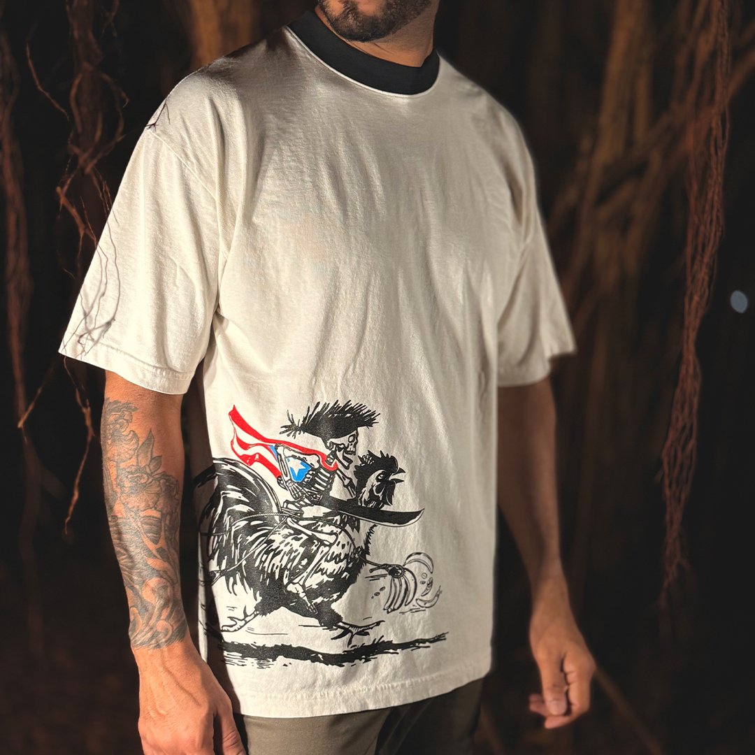 “Resistencia” es una obra que galopa con fuerza hacia adelante, un gallo desbocado cargando en su lomo a un esqueleto que simboliza la lucha eterna. El jinete lleva la bandera de Puerto Rico al cuello como emblema de identidad, un machete en la mano y una pava en la cabeza como grito de dignidad y lucha. Entre el frenesí aparecen plátanos y pitorro, raíces de pueblo, mientras un squeegee de serigrafía afirma la mano obrera y el arte como armas de resistencia. Es movimiento, es furia, es memoria viva que no retrocede.